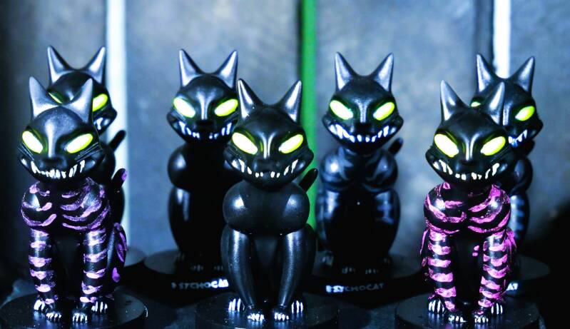 Chaque Psychocat est vendu avec sa boite, réagit à la lumière UV (lumière noir)